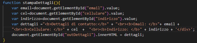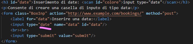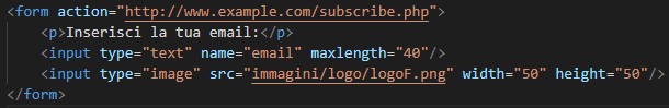 type="email": crea una casella di testo per inserire un indirizzo email; viene verificato il corretto inerimento.