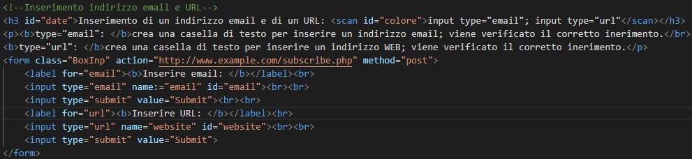 type="url": crea una casella di testo per inserire un indirizzo WEB; viene verificato il corretto inerimento.