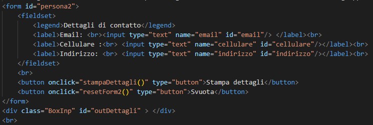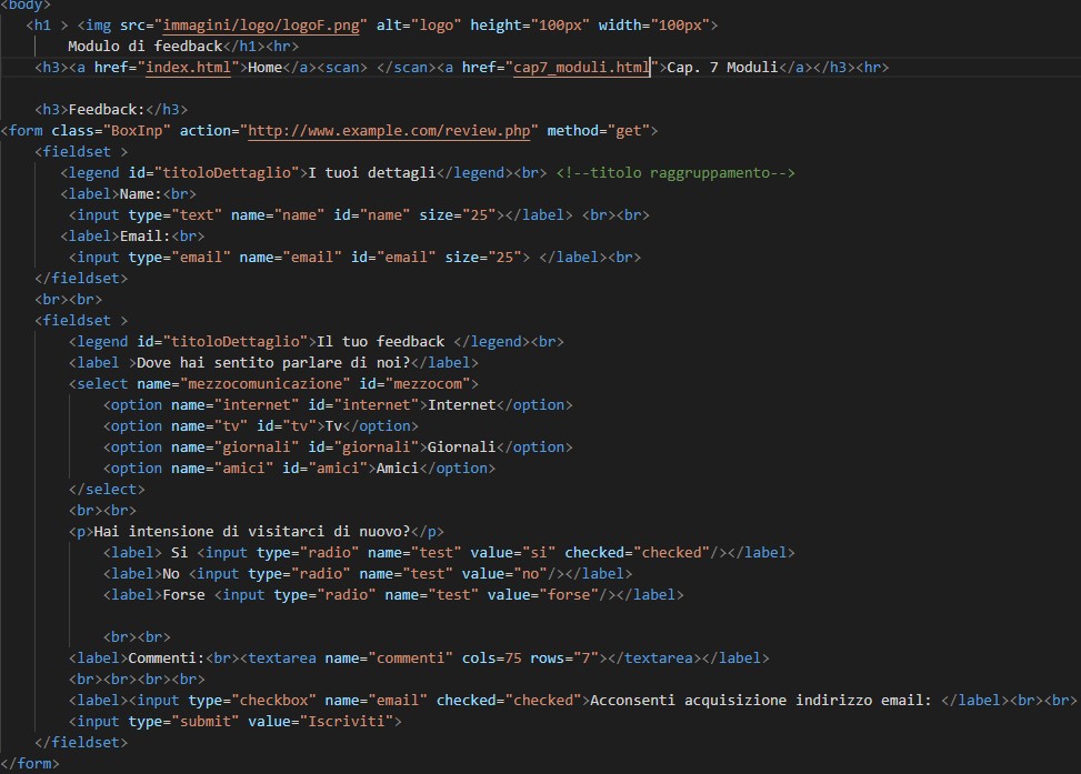 fieldset: raggruppa i controlli correlati di un modulo legend: si trova subito dopo il tag fieldset e contiene il titolo da dare al gruppo di controlli.