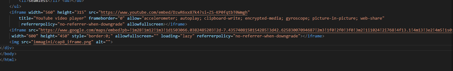 L'elemento iframe crea una finestra all'interno della pagina web, in cui viene visualizzata la pagina web specificata nell'attributo src.