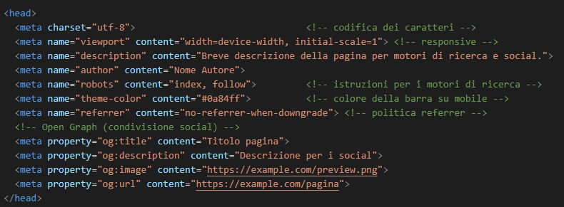 Il tag meta viene inserito all'interno dell'elemento head della pagina HTML.